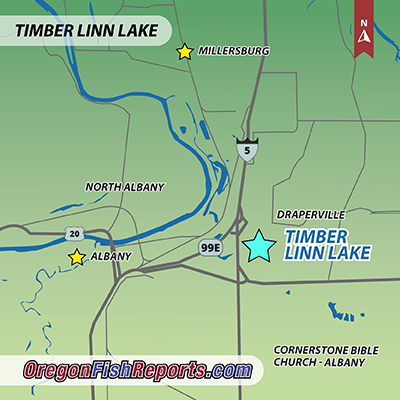 This is a family-friendly fishing pond located within Timber-Linn Memorial Park in Albany. Timber-Linn Lake can be reached by turning east off I-5 onto the Santiam Highway (Hwy. 20), then immediately turning north onto Price Road and proceeding to the park entrance