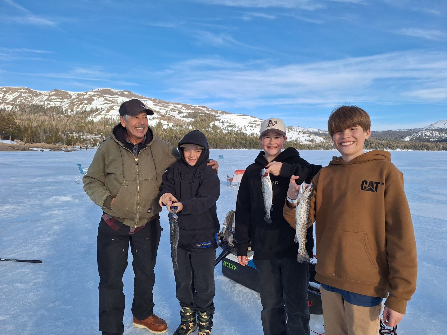 CAPLES LAKE: I had the pressure of fishing with old time friend Joe Garcia and his troupe of boys from South Lake Tahoe. Started off a little slow. Renee ( my better half) and I went out deep for the big ones for an hour or so, with no luck. So we moved in closer to about 10 to 15 ft of water and caught a few small rainbow and a brown. It was a beautiful day and I can't wait to do it again. At that time, the ice was about 10 to 12 inches thick out in front of the lodge. I saw some other anglers down by the spillway and also by the public boat ramp. We also got to watch an ice hockey game be played right behind us. As a note, parking is free along the highway. But if you are not a guest at the resort, they do have a parking day use fee. The resort and restaurant are open for cabin rentals and good food. Best of both worlds, ski in the morning and ice fish in the afternoon. For more information go to capleslakeresort.comor call 209-258-8888.
