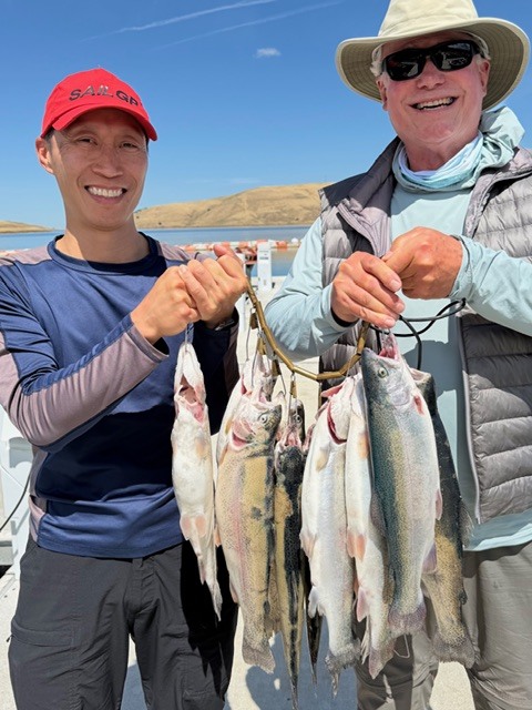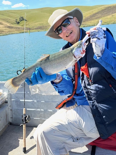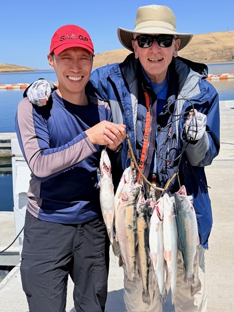 Paul Clouse, Al Hurwitz, and Abel Wong had one of their best fishing days ever at Los Vaqueros Reservoir on April 23, 2026! We caught 12 Mt. Lassen Rainbow Trout and released one, while flatline trolling Jointed Rapalas in various sections of Cox Cove. The fish were caught about 6-8 feet below the surface, trolling at 2.0 mph. Scent was applied to the lures. The aggregate weight of the 11 kept Trout was 28 pounds. Pictured here are Al (blue coat), Abel (red hat), and Paul (gray sleeveless jacket) displaying the catch.